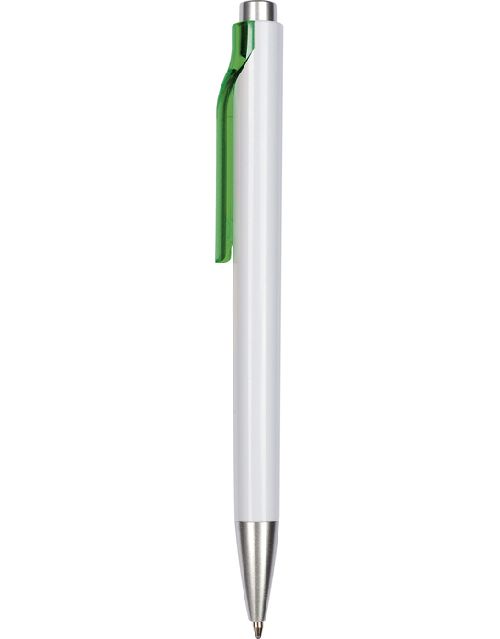 Plástico. Cuerpo blanco. Pulsador y puntera color plata. Clip con detalle de color transparente. Tinta negra.