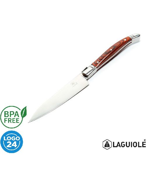 Cuchillo de diseño francés Utility 4,5" con hojas de acero forjado 420. Cuenta con mango de ABS con detalles metálicos y mango de madera noble. Packaging: caja de madera con cuna. Incluye otra caja contenedora de cartón laminada para su protección. Medida cuchillo: 23 cm. Medida caja individual: 26c x 6 cm. Producto libre de BPA. Laguiole. El descuento ya se encuentra aplicado en la web. LOGO24: Producto disponible para el servicio de logueo en 24hs, respetando unidades mín. de logueo y 200 unidades máx. Consultar términos del servicio.
