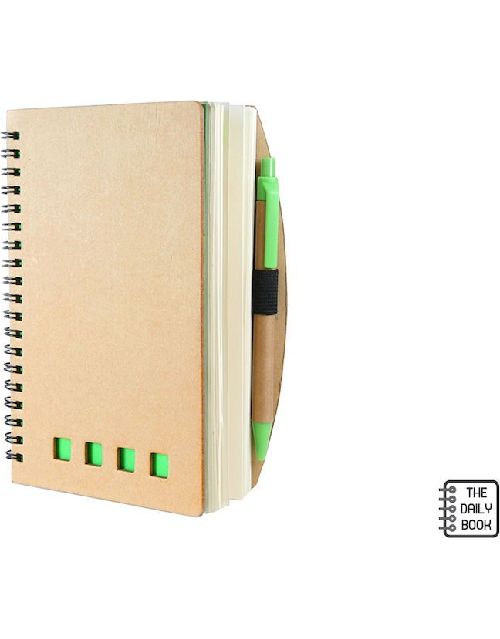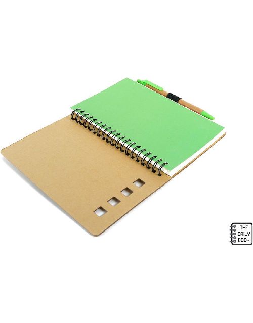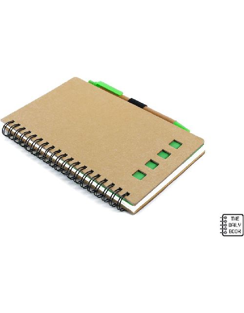 Cuaderno espiralado con tapa de cartón. 80 hojas blancas lisas, sujetador elástico para bolígrafo.Incluye bolígrafo. Medidas: 17,5 x 19 cm. The Daily Book.