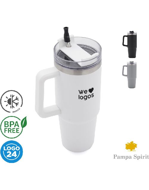 Jarro de doble pared con capacidad 887ml. Está confeccionado en acero inoxidable 304 en su interior, y su exterior en acero inoxidable esmaltado. Tapa antiderrame realizada en ABS y PP, con sorbete incluido de silicona y acero inoxidable. El producto viene en una bolsa de PLA 100% compostable dentro de una caja de cartón. Ideal para uso diario. Dimensiones: 24,5 x 9 cm | 7 cm la base | 26 cm de largo sorbete. Pampa Spirit. LOGO24: Producto disponible para el servicio de logueo en 24hs, respetando unidades mín. de logueo y 200 unidades máx. Consultar términos del servicio. Incluye GiftBox confeccionada en cartulina Kraft ¡personalizala con un mensaje especial!