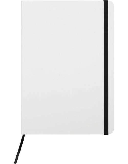 Cartón. 21 x 14,5 x 1,2 cm. Tamaño similar a A5. Libreta de tapa dura color blanco. Contiene 80 hojas rayadas. Posee cierre con banda elástica y separador en tela del mismo color.