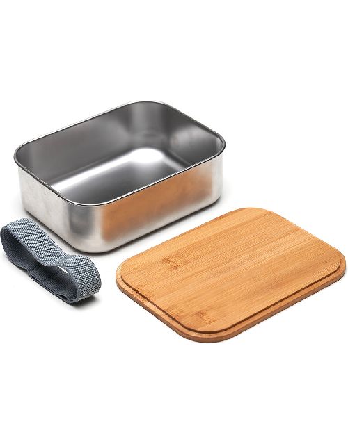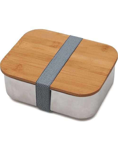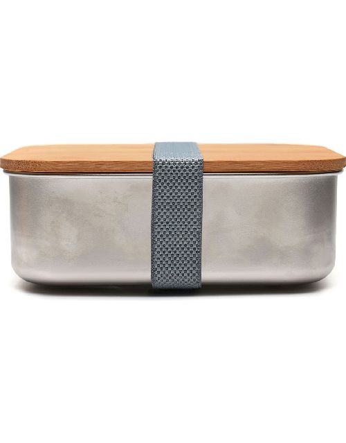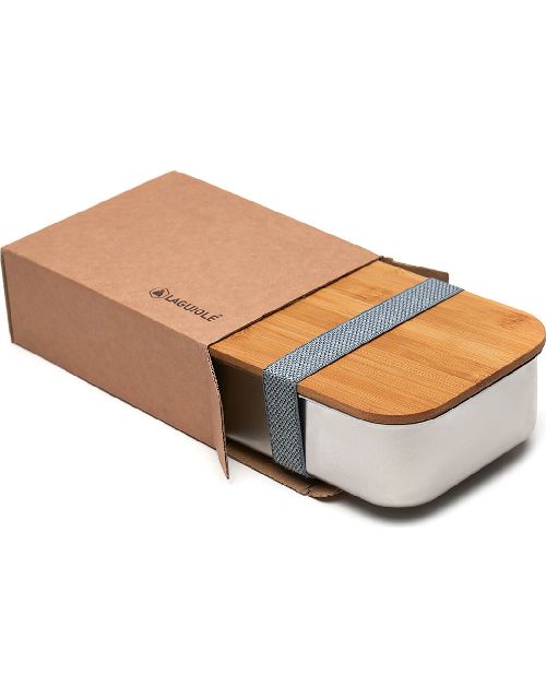 Contenedor de alimentos en acero. Posee tapa de bamboo y elástico para su correcto cierre. Dimensiones: 18 x 14 x 7 cm. Producto libre de BPA. Laguiole.