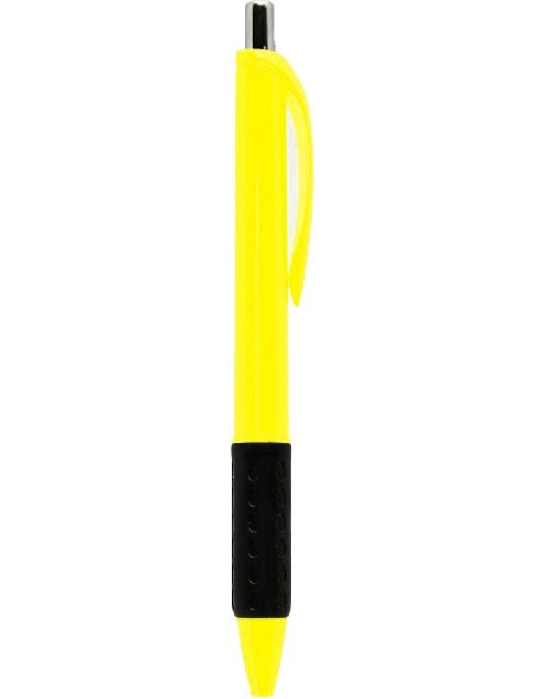 Bolígrafo con cuerpo plástico de color. Grip de goma negro. Pulsador metálico. Retráctil. Tinta negra. Producto libre de BPA.