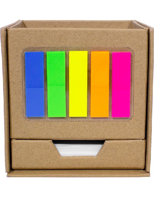 10 x 10 x 10 cm. Cartón. Porta Lápiz con post-it de tiras de diferentes colores flúo en el frente. Empujando hacia adelante, encuentras block rectangular con autoadhesivos de color amarillo y en la parte inferior un contenedor con hojas blancas de 7,4 x 8,7 cm. Producto Reciclable. Presentado en POLYBAG (bolsa plástica)