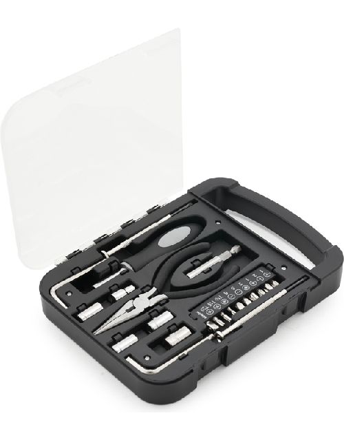 Set de herramientas, con en maletin de tapa transparente. Incluye: pinza, 2 llaves allen, destornillador de puntas intercambiables y 2 mini destornilladores Medidas: 22 x 16 x 2,7 cm.